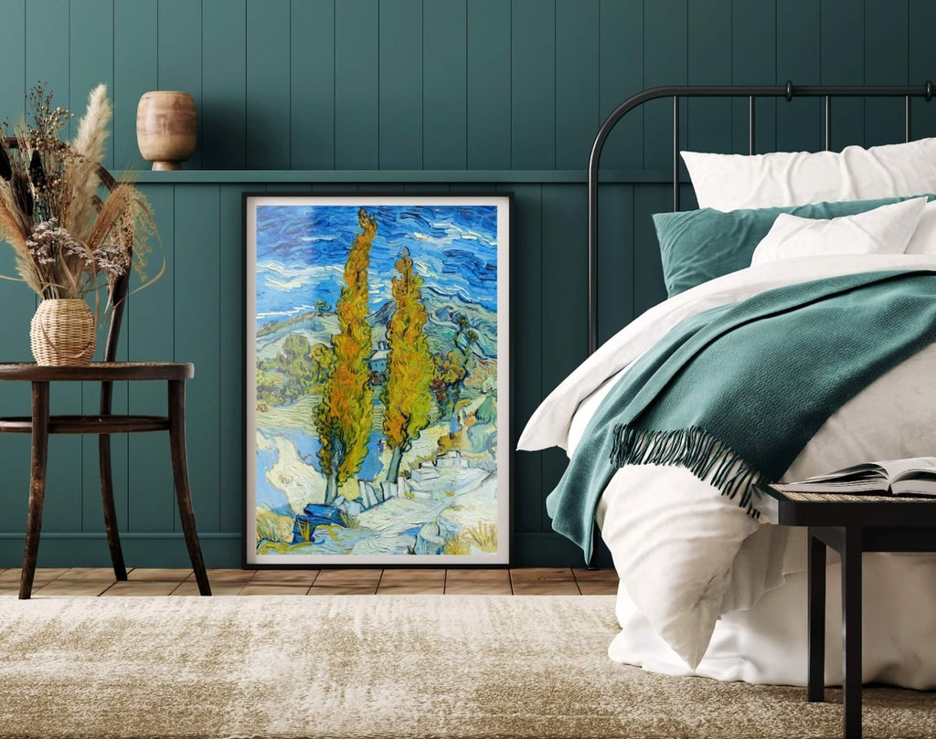 Tipping slightly more abstract than impressionist, Van Gogh painted this gorgeous visual of poplar trees on the hills of Saint-Remy, France. If this painting feels especially reminiscent of another one of Van Gogh’s works – Road with Cypress and Star – that’s because it was created around the same time and location, while Van Gogh resided at a mental hospital in the area.