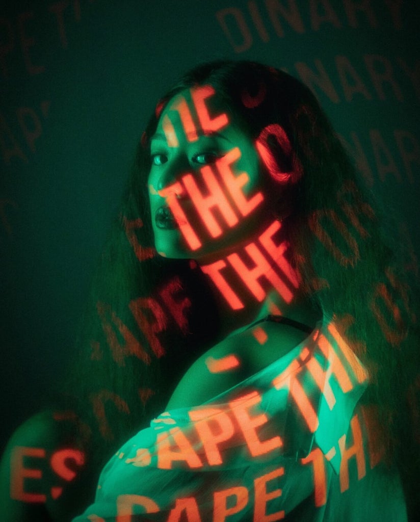 Once you add words to projector photoshoots, the possibilities of this photoshoot style become endless. From song lyrics to repeating phrases or personal quotes, mastering the effect of projected words ensures you’ll never run out of projector photoshoot ideas.