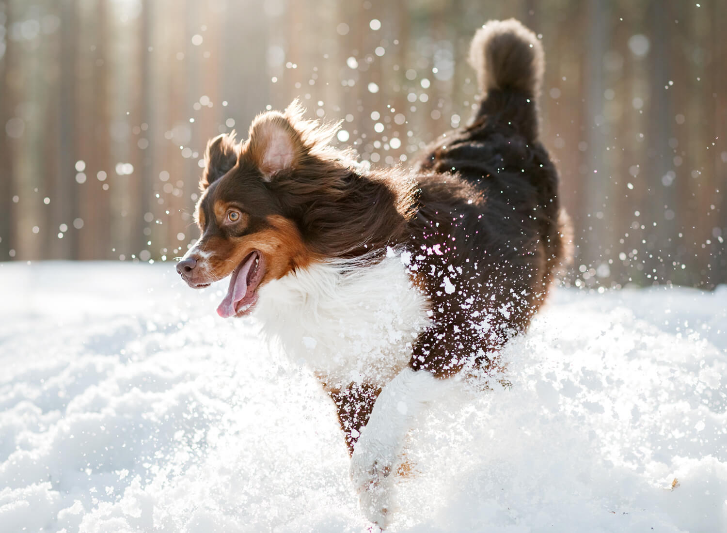 When attempting to catch the action, make sure to keep the shutter speed of your camera high so that you are able to capture motion clear and prevent blur. A shutter speed of over 250th/sec is plenty to freeze your pup mid-run. You should have plenty of light for your exposure at that speed with the brightness of the snow.