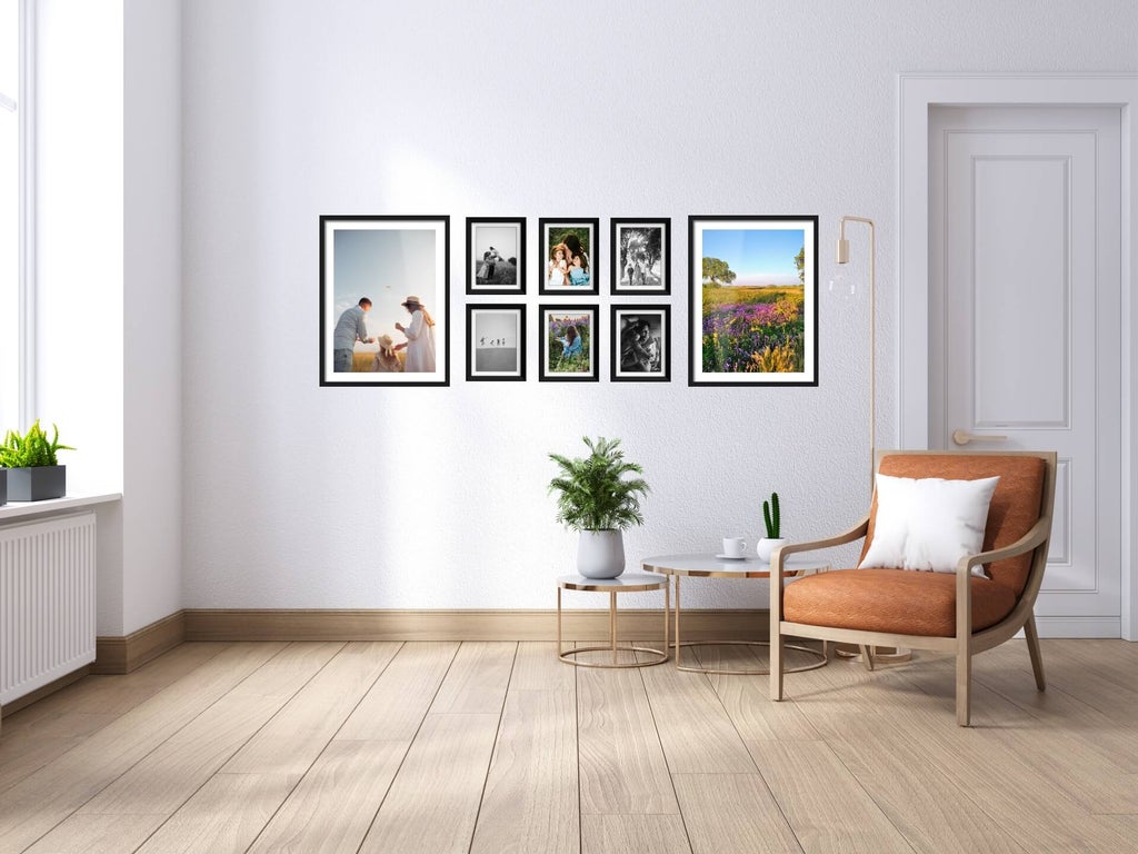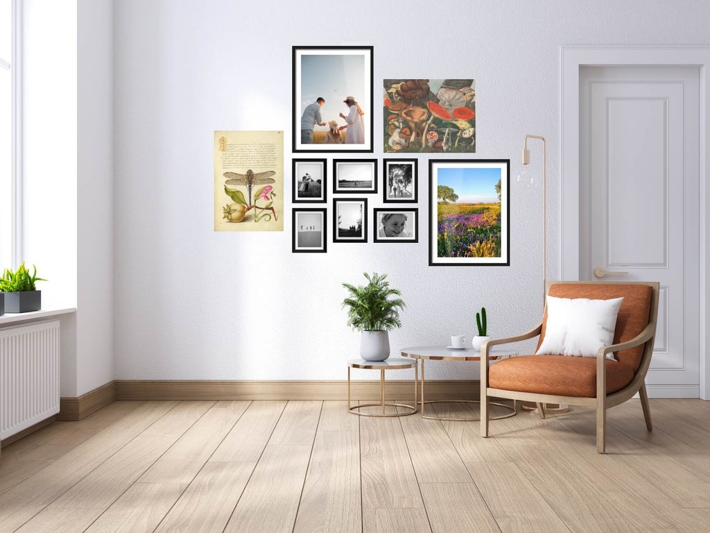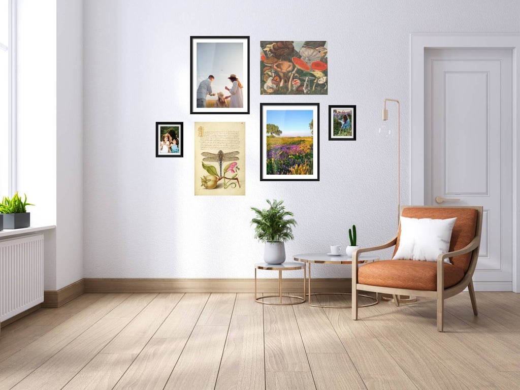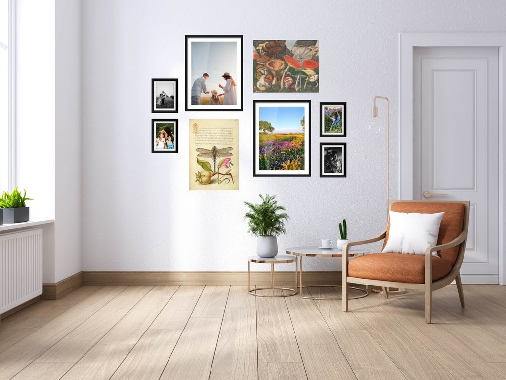 For the final step of this gallery, cap the ends of your gallery with two framed poster prints. For the most aesthetic result, print photos that connect with the color scheme of your starter prints!