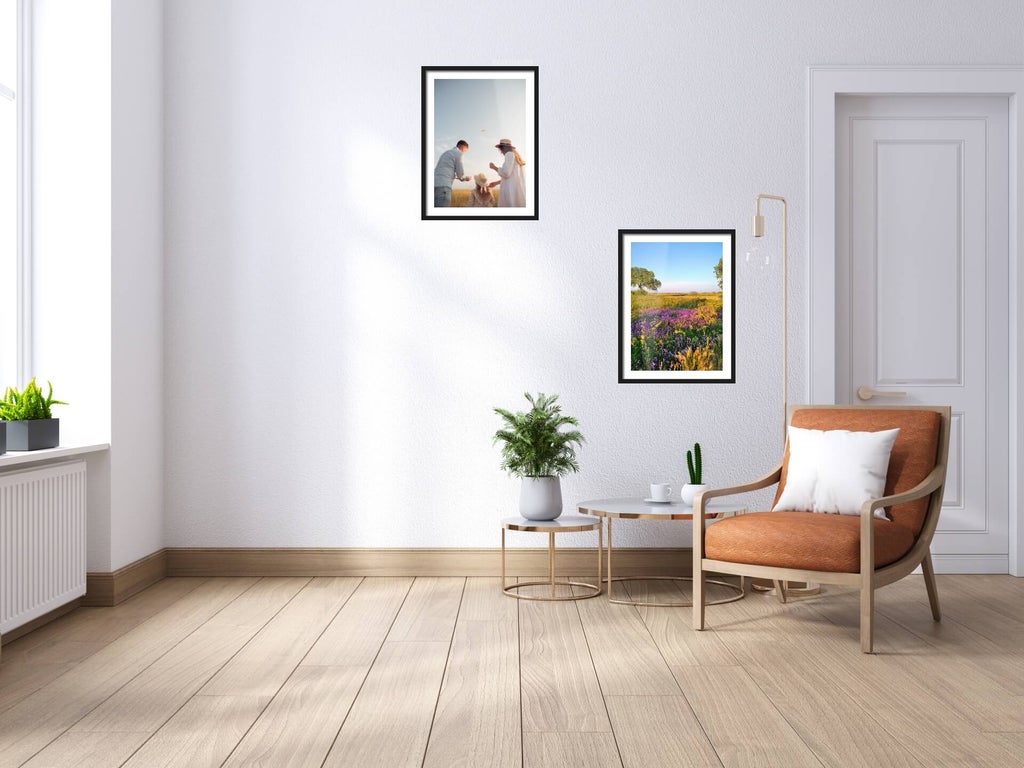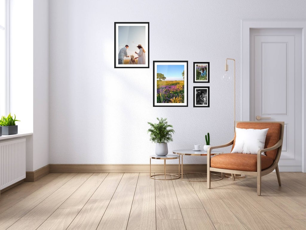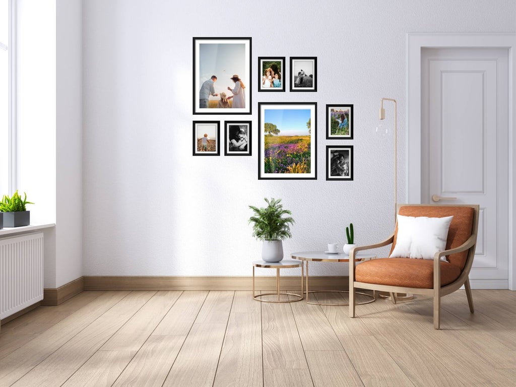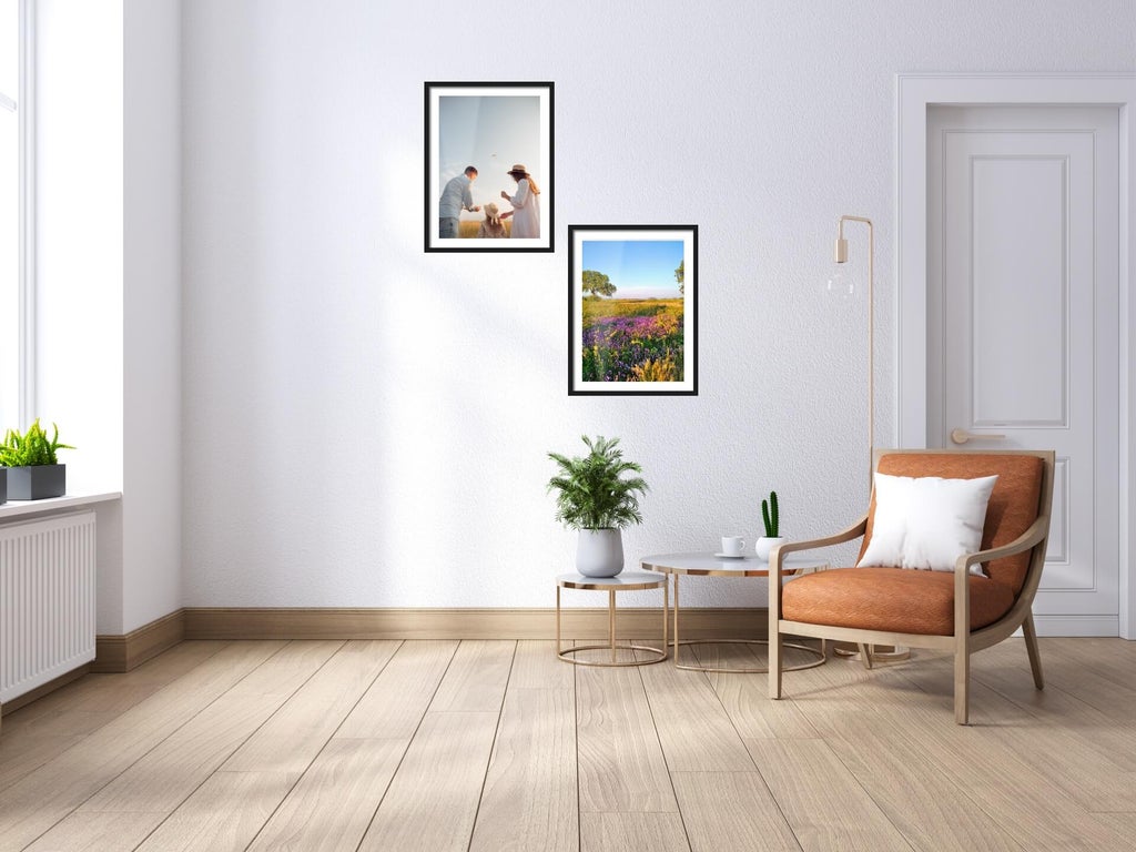 For the final step of this gallery, cap the ends of your gallery with two framed poster prints. For the most aesthetic result, print photos that connect with the color scheme of your starter prints!