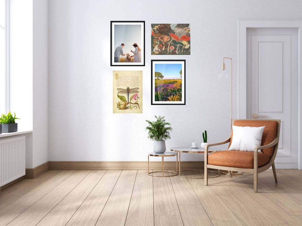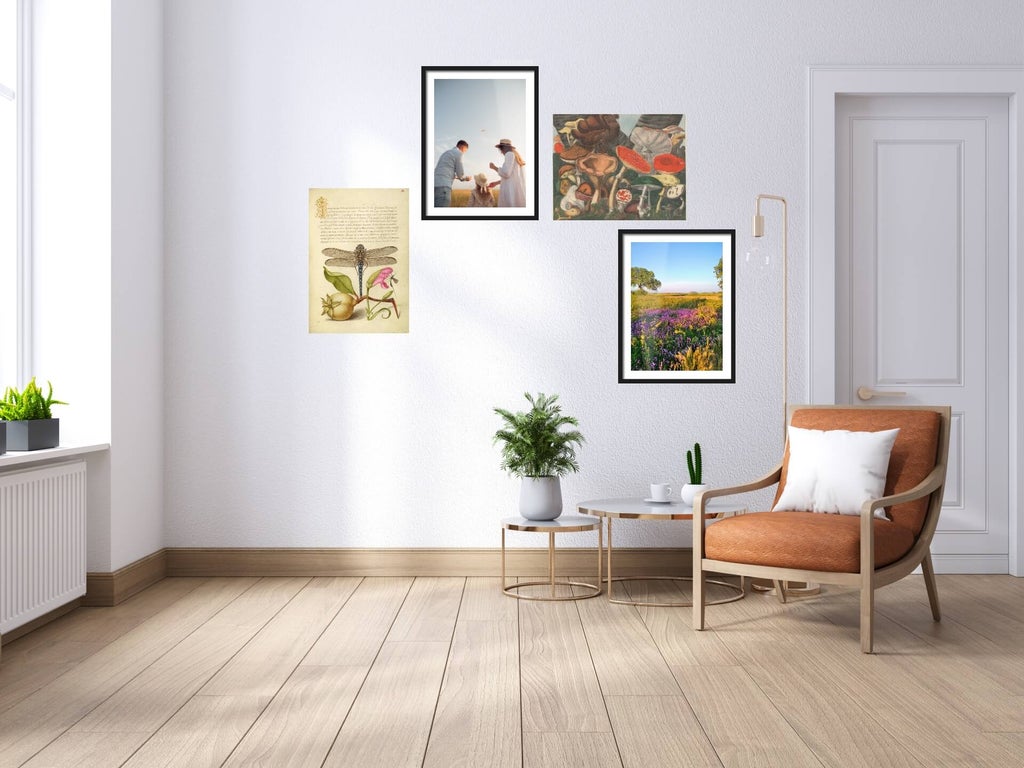 Once you’ve hung your large framed prints, fill in the outer borders of your gallery with two unframed poster prints. For the frameless prints, we recommend printing textured, vintage illustrations. This will help keep their presence large even without a frame.
