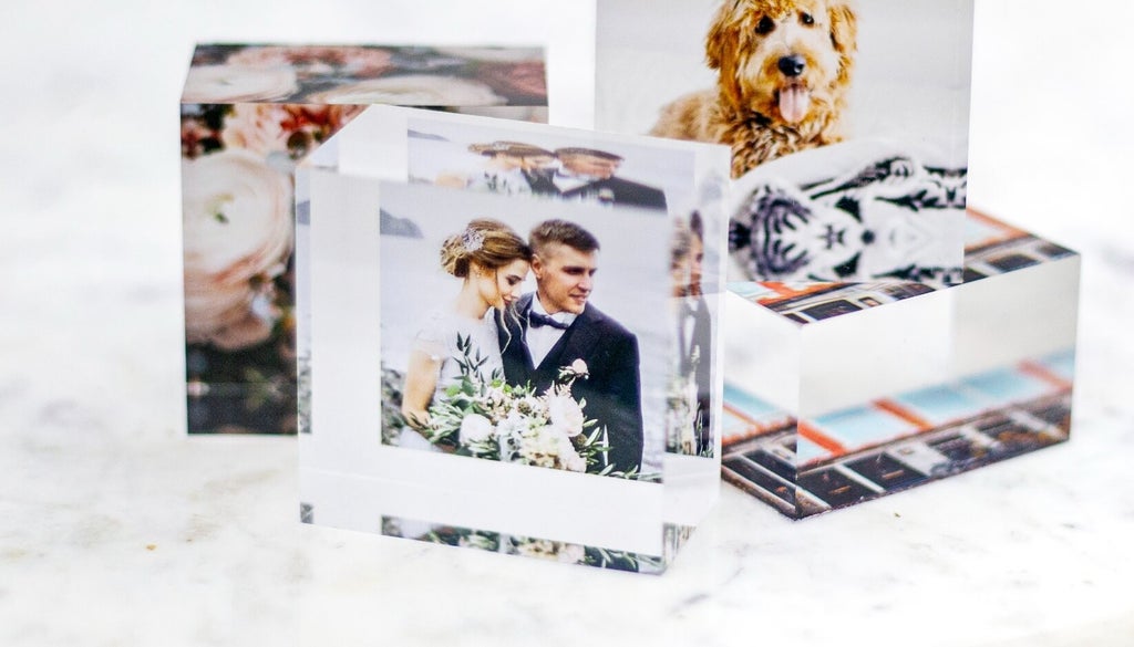 Acrylic photo blocks are one of our most loved products. These incredibly durable, museum-quality pieces can stand on their own when printed in block form, making them the perfect addition to any shelving space. Their clean, modern, and elevated feel make them hard to beat when it comes to refreshing a previously hodgepodge space. Arranging them miscellaneously across a large span of shelving is a great way to tie together a bigger space, like shelves that cover an entire wall.