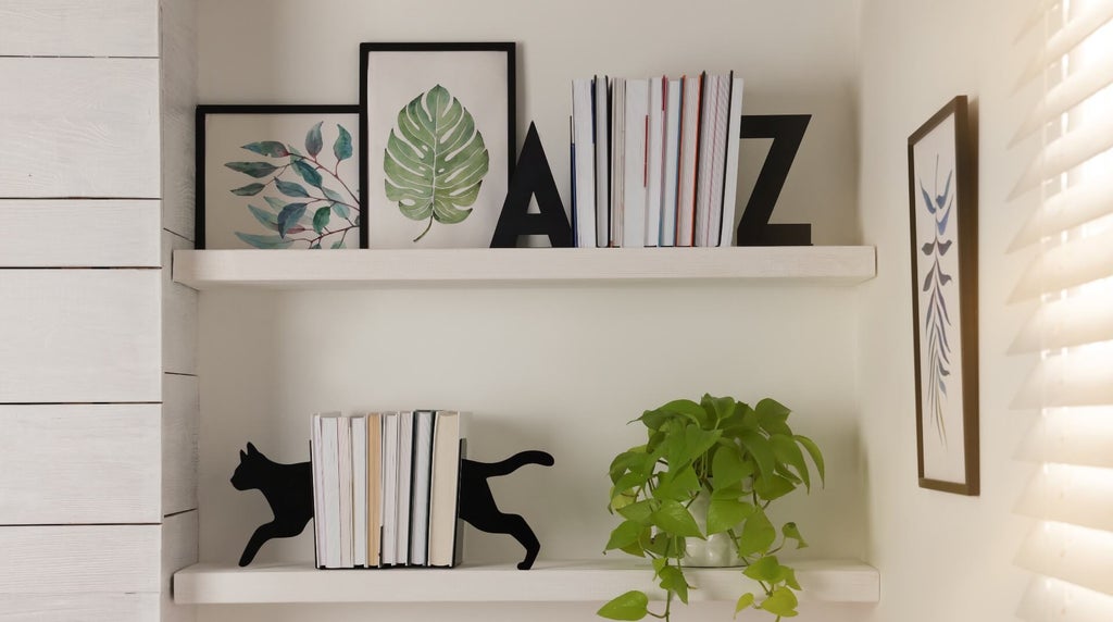 Don’t let the beauty of your redesigned bookshelf stand alone! Build off of your bookcase to blend it aesthetically with its surroundings. Space out wall décor at eye level beside the shelf or arrange large plants alongside the base of your shelving.