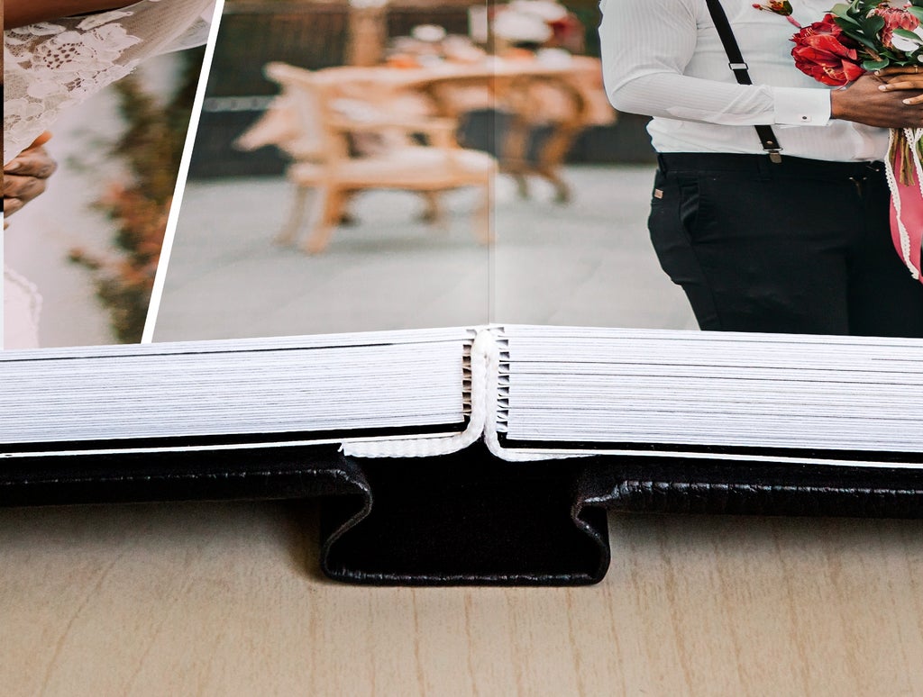 The color, material, and title of your album should be chosen with utmost care. These are the first things you’ll see every time you settle in to flip through the pages of your prized possession. If you know you want a particular picture featured on the cover of your wedding album, we recommend ordering a hardcover album. This way you can feature an image as a full wraparound cover; This can’t be done with leather or fabric cover albums. Alternatively, if you want your photo album to feel thick and authentic when you hold it, our leather covers are the perfect selection. For peak luxury, enjoy the best of both worlds with our metal cover albums. Whatever you choose, choose it with intention and you’re sure to be overjoyed with what arrives.