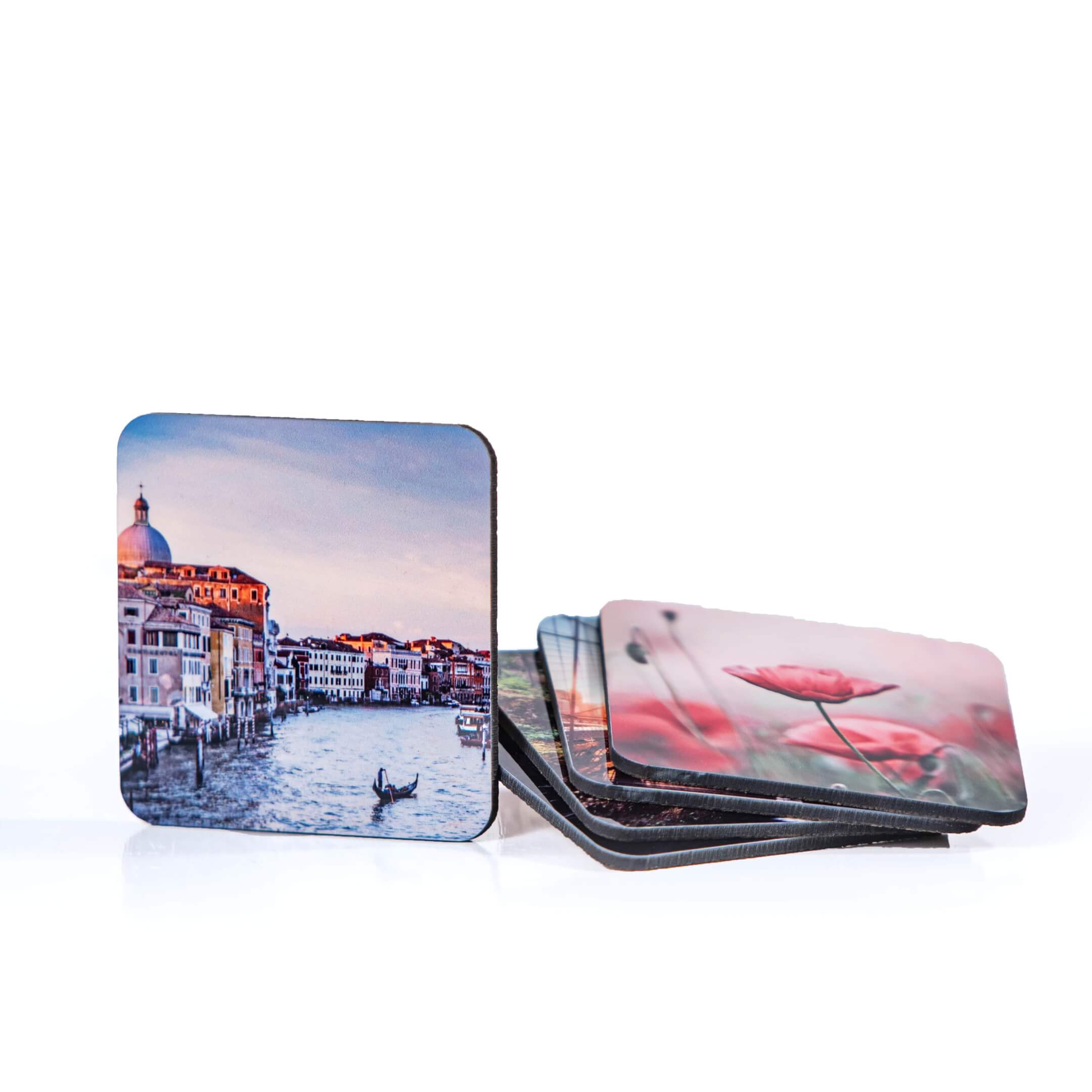 Complete your tablescape with a Set of 4 Photo Coasters! Simply choose one of your favorite images to be carried across all coasters or select 4 different images to showcase your favorites. Also makes the perfect housewarming, holiday, or wedding gift! Custom coasters are composed of waterproof, high-gloss plastic with anti-slip cork backing. Photo coaster size is 3.75″ square.